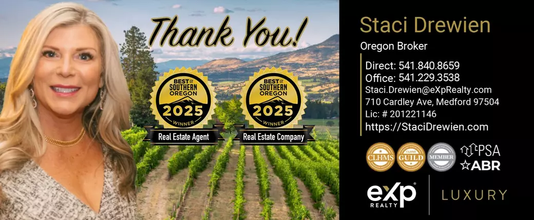 We are excited to share that Staci Drewien - eXp Luxury, with eXp Realty of Southern Oregon, has been awarded Double Gold for Best Real Estate Agent and Best Real Estate Company in the 2025 Best of Southern Oregon Awards! This recognition highlights her exceptional service and results in the Southern Oregon real estate market.